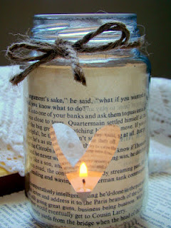 Grab some old books with weathered paper, some scissors, a bit of glue and viola! Plain glass jars would work best. Love this!